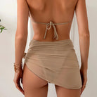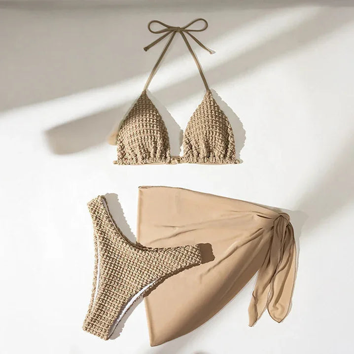 Bikini z klasycznym trójkątnym stanikiem podłączonym na plecach. Wysoki stan majtek podkreśla talię, materiał dobrze stosowany w ciałach. W zestawie lekka, półprzezroczysta narzutka z siateczki, związana z boku. Dobrana kolorystycznie do bikini, dodaje całościowej elegancji i lekkości.