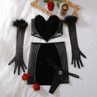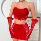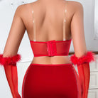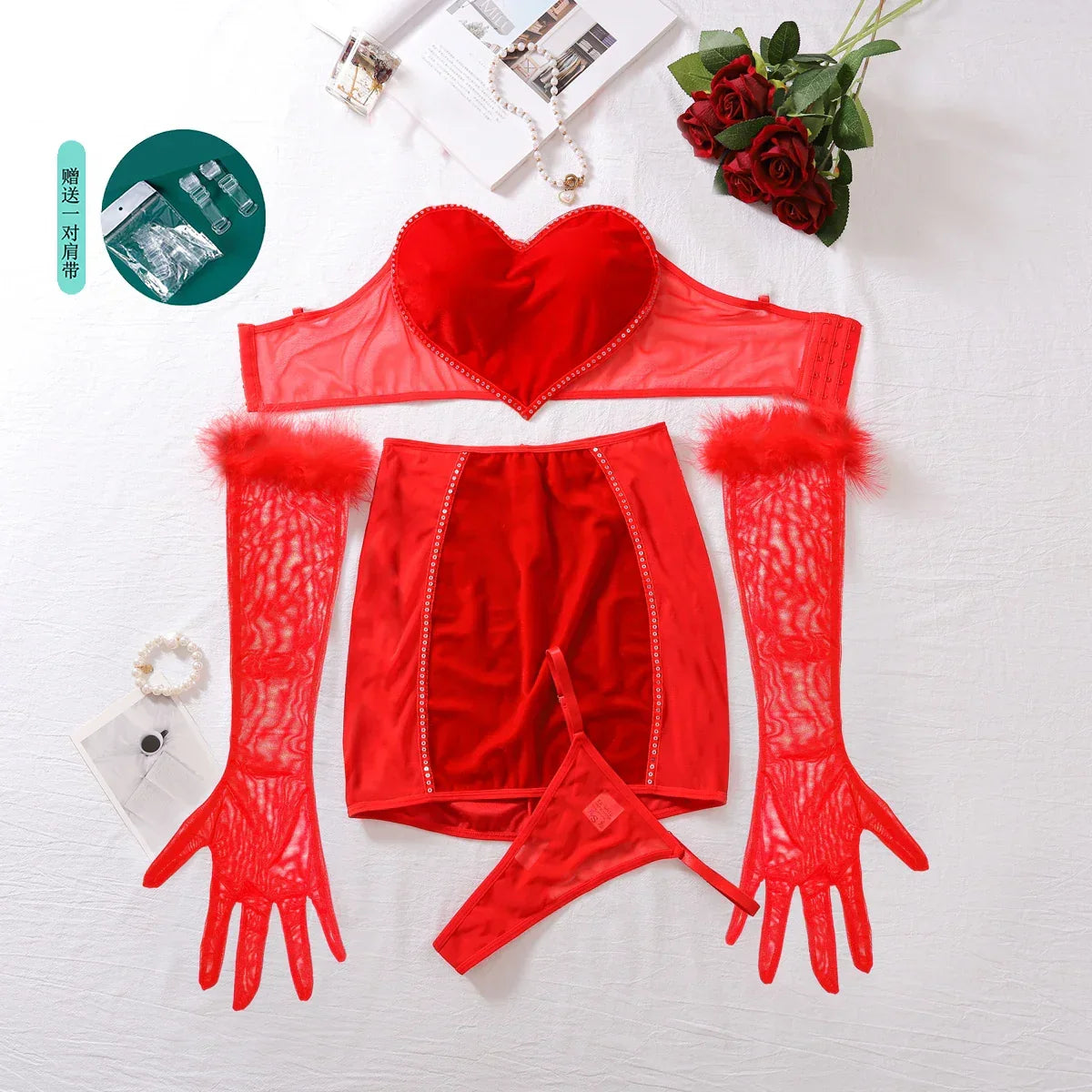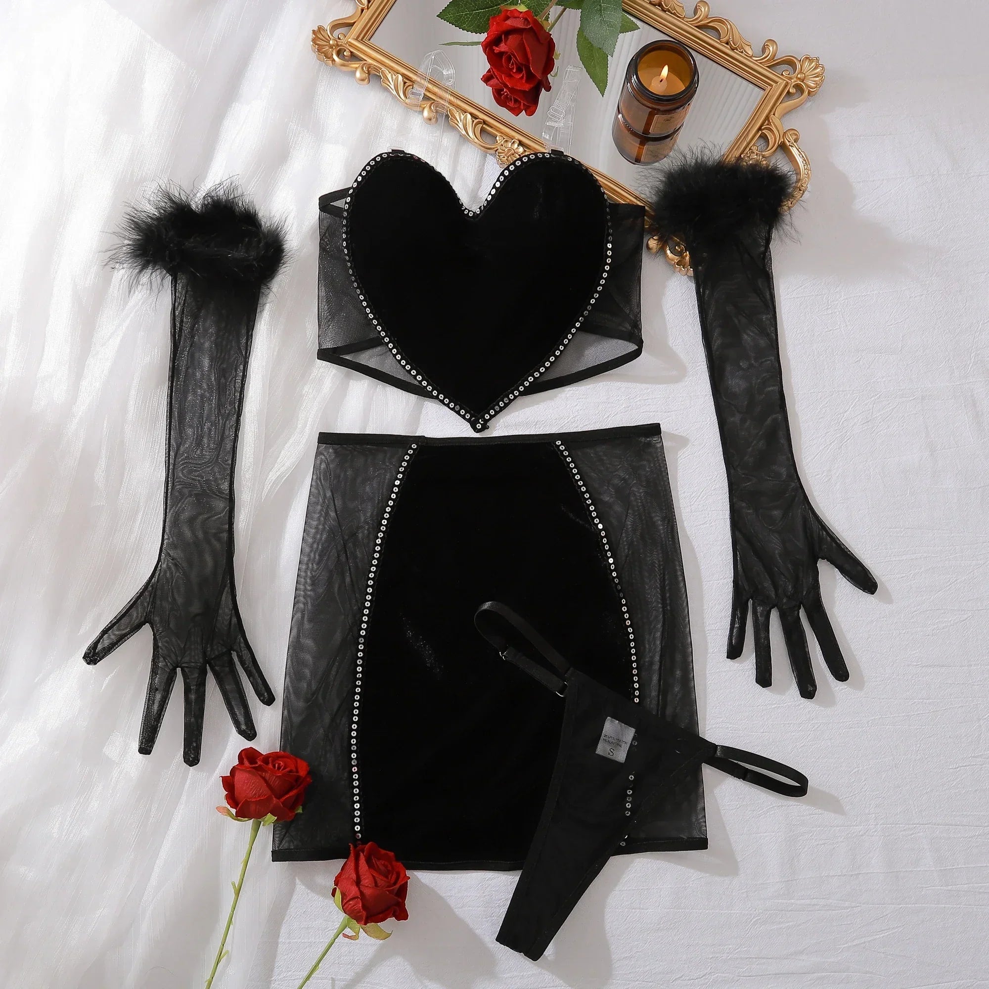 Uwodzicielski komplet w intensywnej czerwieni, składający się z krótkiego topu w kształcie serca, mini spódniczki i stringów. Całość ozdobiona lśniącymi kryształkami, które pięknie odbijają światło. Przezroczyste ramiączka topu nadają efekt „niewidzialnego podtrzymania”, a do kompletu dołączone są długie rękawiczki z piórkami przy mankietach.