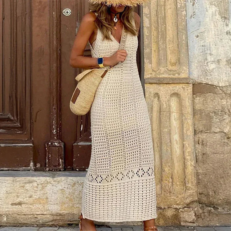 Długa damska narzutka plażowa wykonana z lekkiego materiału w stylu szydełkowym. Posiada ażurowy wzór na całej długości. Bez rękawów, przewiewna i idealna na lato – sprawdzi się jako dodatek do stroju kąpielowego lub letniej stylizacji.