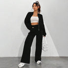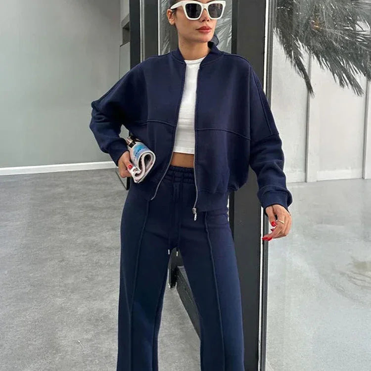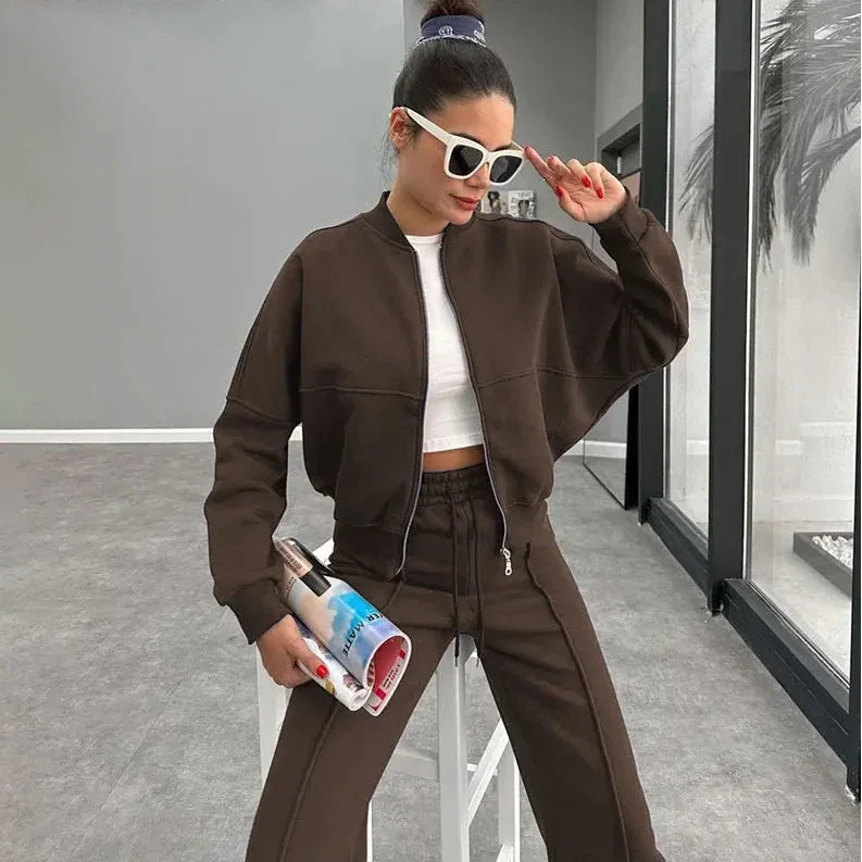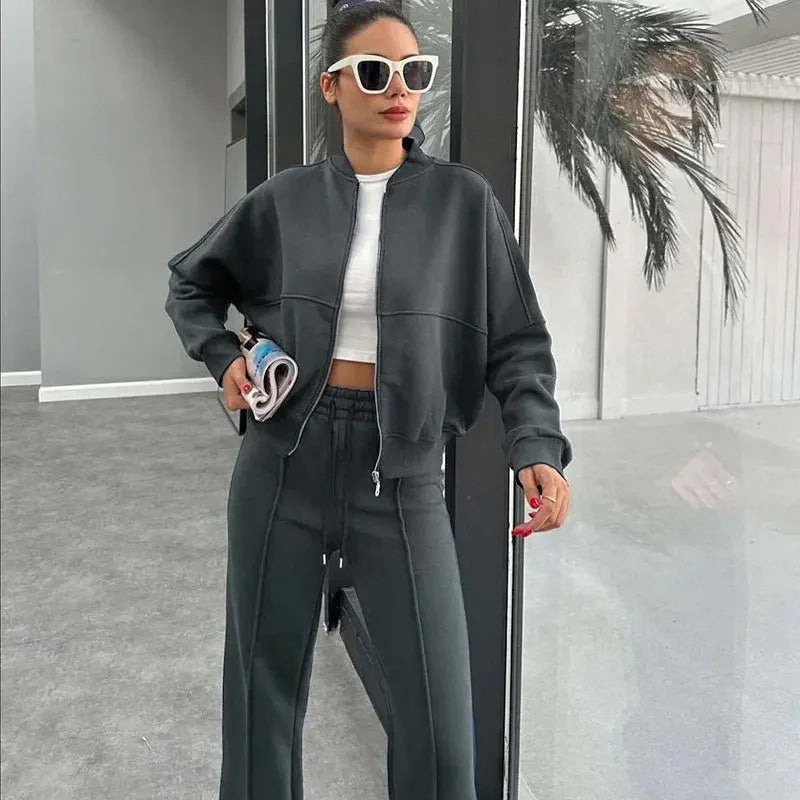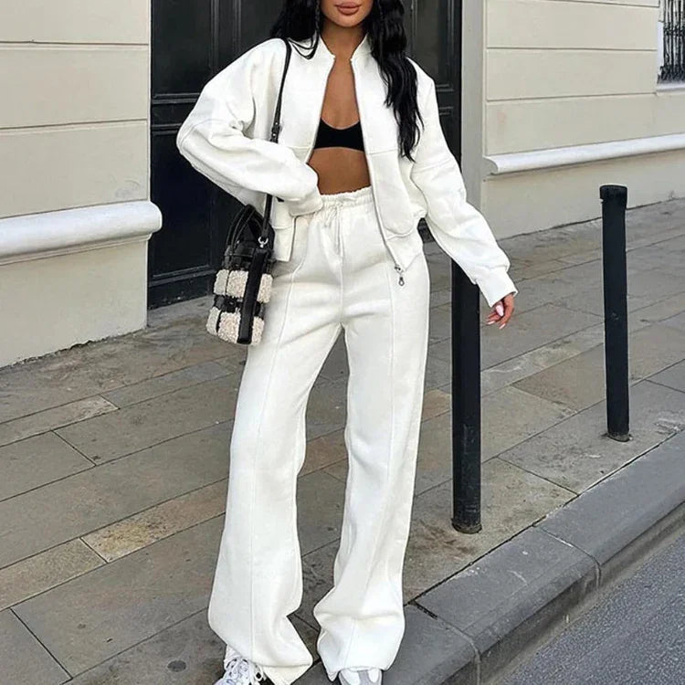Nowoczesny komplet w stylu streetwear – połączenie wygody i elegancji w jednym. Zestaw składa się z krótkiej bluzy zapinanej na zamek oraz spodni z wysokim stanem i prostą nogawką. Wykonany, aby było komfortowo i ciepło. Idealny na spacer, zakupy czy luźne spotkania w mieście.