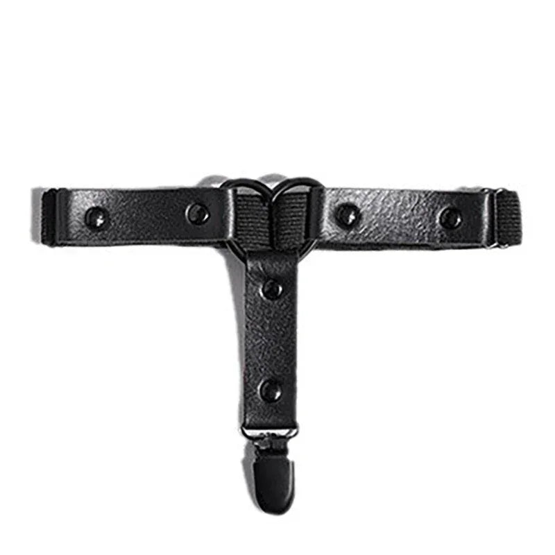 Podwiązka wykonana z ekoskóry. Ozdobiona metalowym serduszkiem pośrodku. Posiada dodatkowy pasek zakończony klipsem do przypięcia pończoch. Świetnie pasuje do wysokich skarpet lub rajstop.